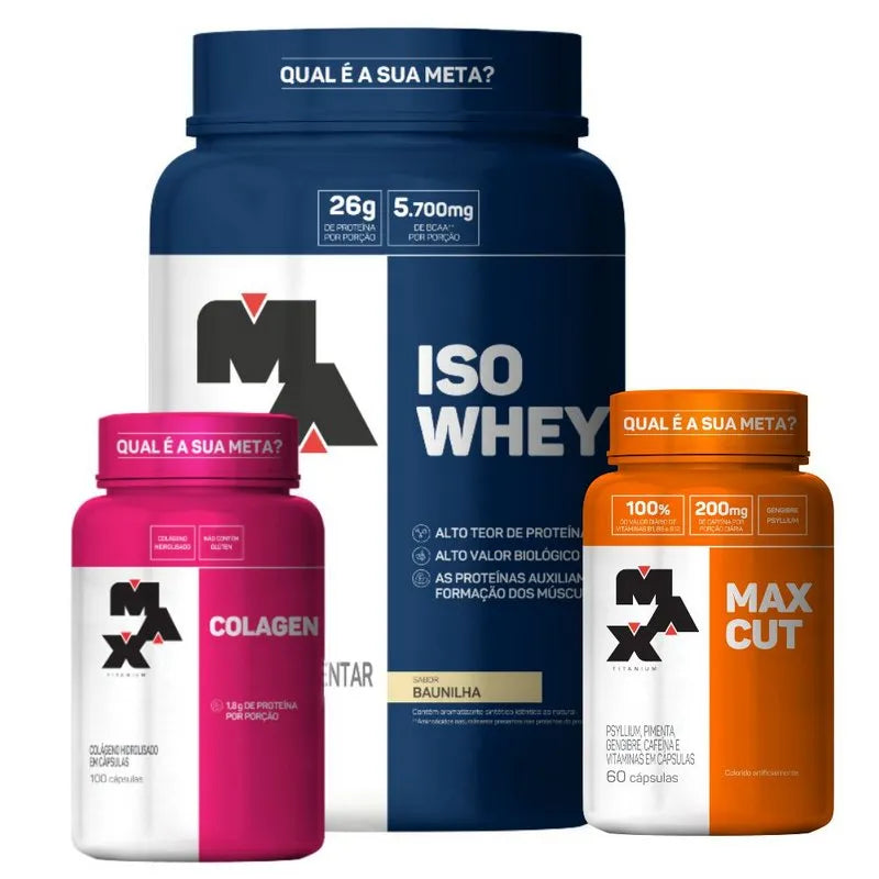 1 unidade de Iso Whey 900g (sabor a escolha) + 1 unidade de Max Cut 60Cps + 1 unidade de Colagen 100Cps