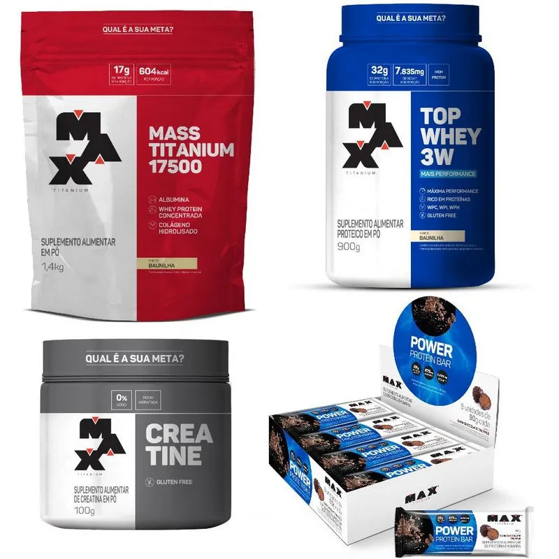 1 unidade de Top Whey + Performance (sabor a escolha) + 1 unidade de Mass Titanium 1,4kg (sabor a escolha) + 1 unidade de Creatina 100g + 1 unidade de Power Protein Bar (sabor a escolha)