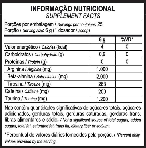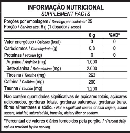 Sua formulação é concentrada e é fonte dos aminoácidos beta-alanina, taurina, cafeína, arginina e tirosina, que atuam em sinergia para auxiliar ainda mais seu desempenho.