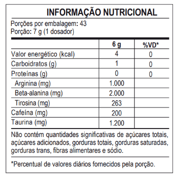 Sua formulação é concentrada e é fonte dos aminoácidos beta-alanina, taurina, cafeína, arginina e tirosina, que atuam em sinergia para auxiliar ainda mais seu desempenho.
