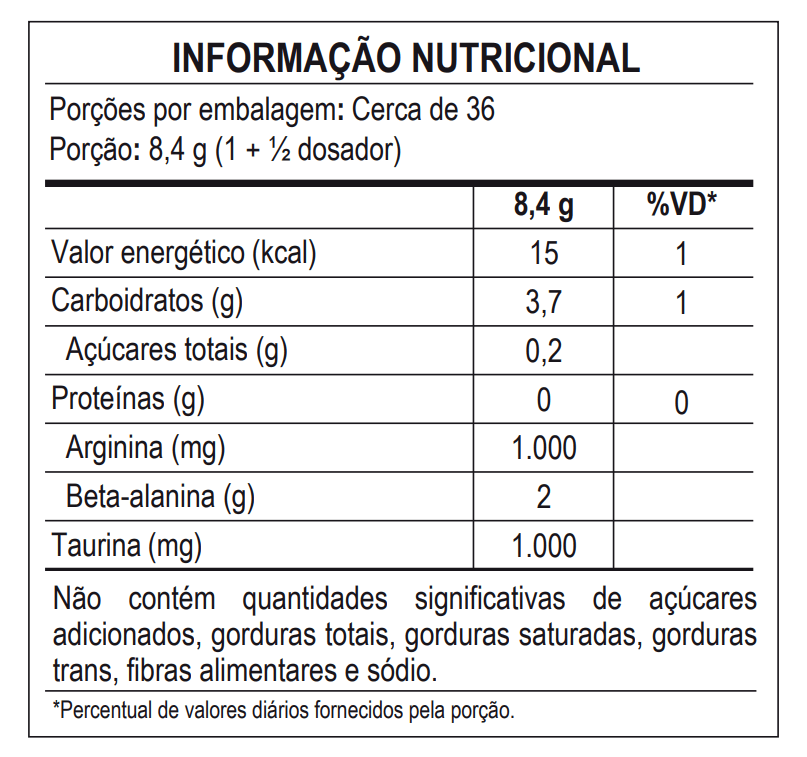 Beta-alanina, isomaltulose, L-arginina, taurina, aromatizantes, acidulante ácido cítrico, edulcorante sucralose, antiumectante estearato de magnésio e corantes artificiais amaranto e azul brilhante fcf. NÃO CONTÉM GLÚTEN.