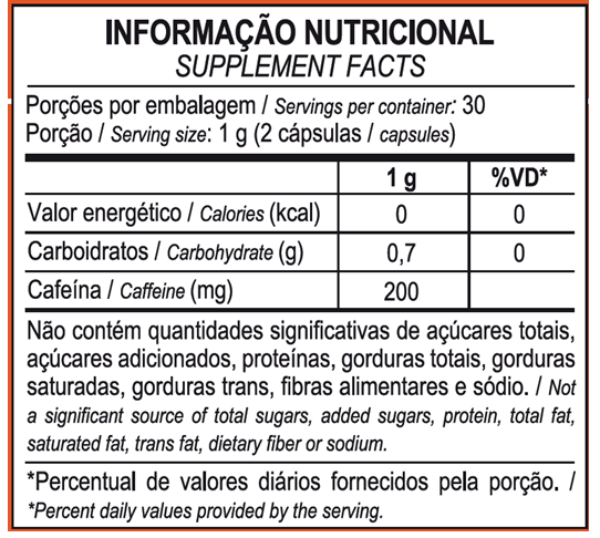 Ele traz em sua fórmula 200mg de cafeína na porção diária, a cafeína auxilia no aumento da capacidade de resistência e no desempenho de exercícios físicos de resistência.