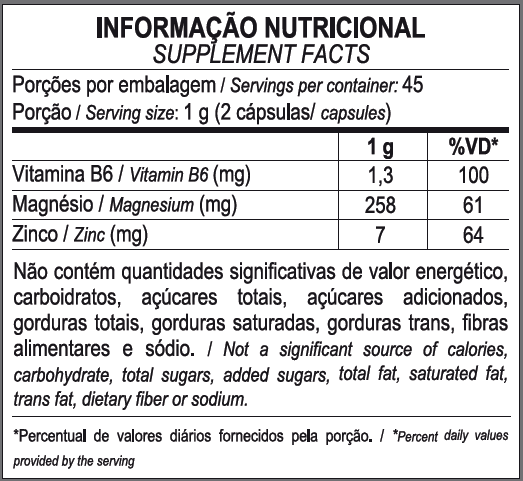 Bisglicinato de magnésio, óxido de magnésio e hidróxido de magnésio, maltodextrina, bisglicinato de zinco, cloridrato de piridoxina (vitamina B6) e cápsula (gelatina, corantes dióxido de titânio, vermelho 40, amarelo de quinoleína, azorrubina e azul brilhante FCF).
