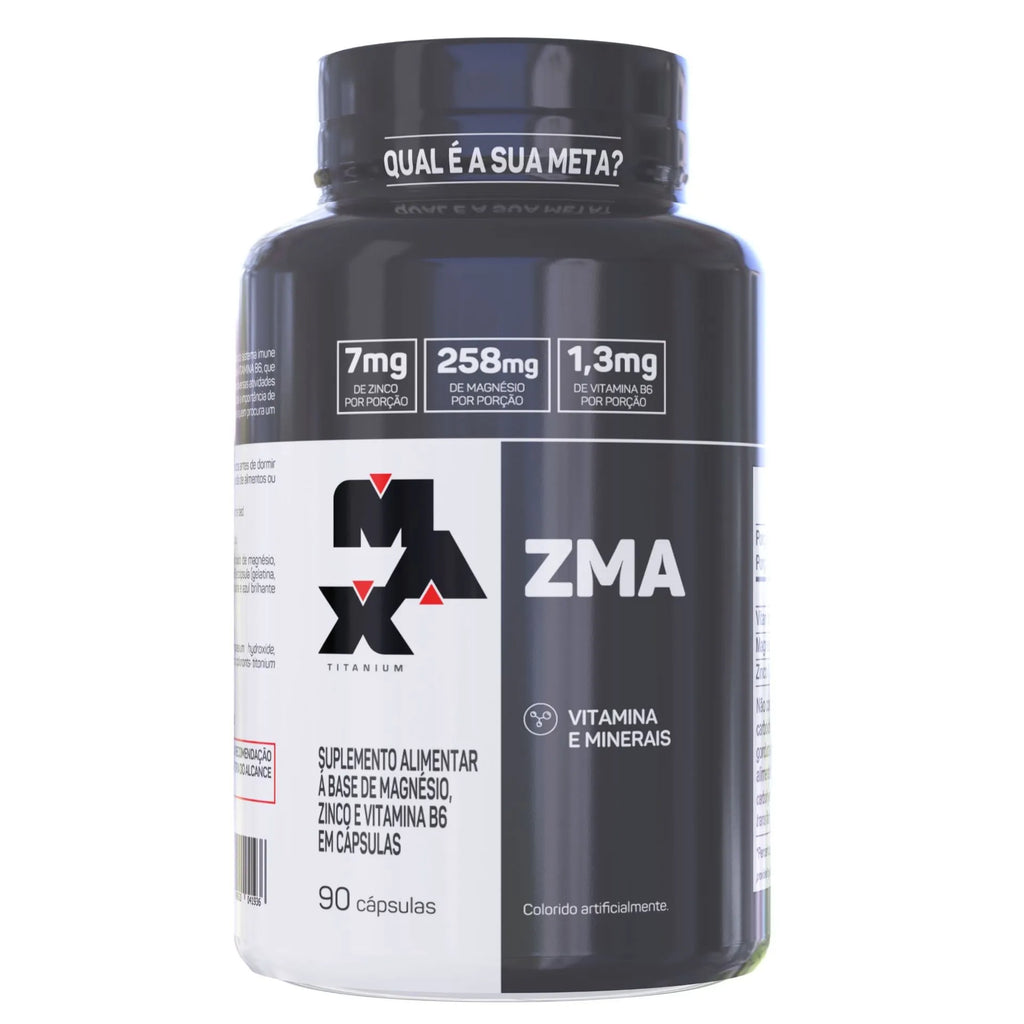 O ZMA da Max Titanium é composto por ZINCO, que auxilia no funcionamento do sistema imune e na síntese de proteínas, MAGNÉSIO, que auxilia no funcionamento muscular e VITAMINA B6, que auxilia no metabolismo energético.